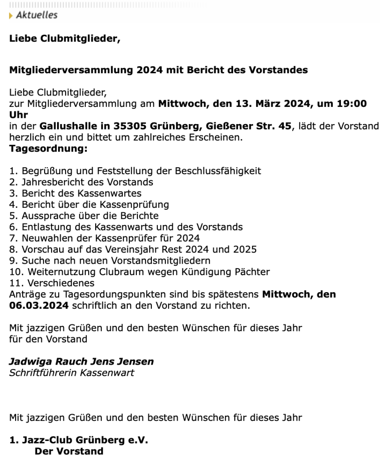 - Der Jahresbeitrag für eine Mitgliedschaft im 1. Jazz-Club Grünberg e.V. beträgt (seit 2016)